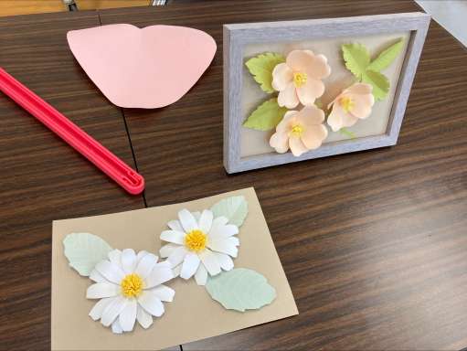 図書館スタッフによる説明のもと、まずはお花づくりから行いました。 花びらとなるパーツの色画用紙にクセをつけ、本物のような立体感を出していきます。 花芯をくるくると巻いて、丁寧に広げ貼り付けます。 葉っぱは葉脈を描く細かい作業でしたが、みなさん真剣に取り組んでいただきました。
