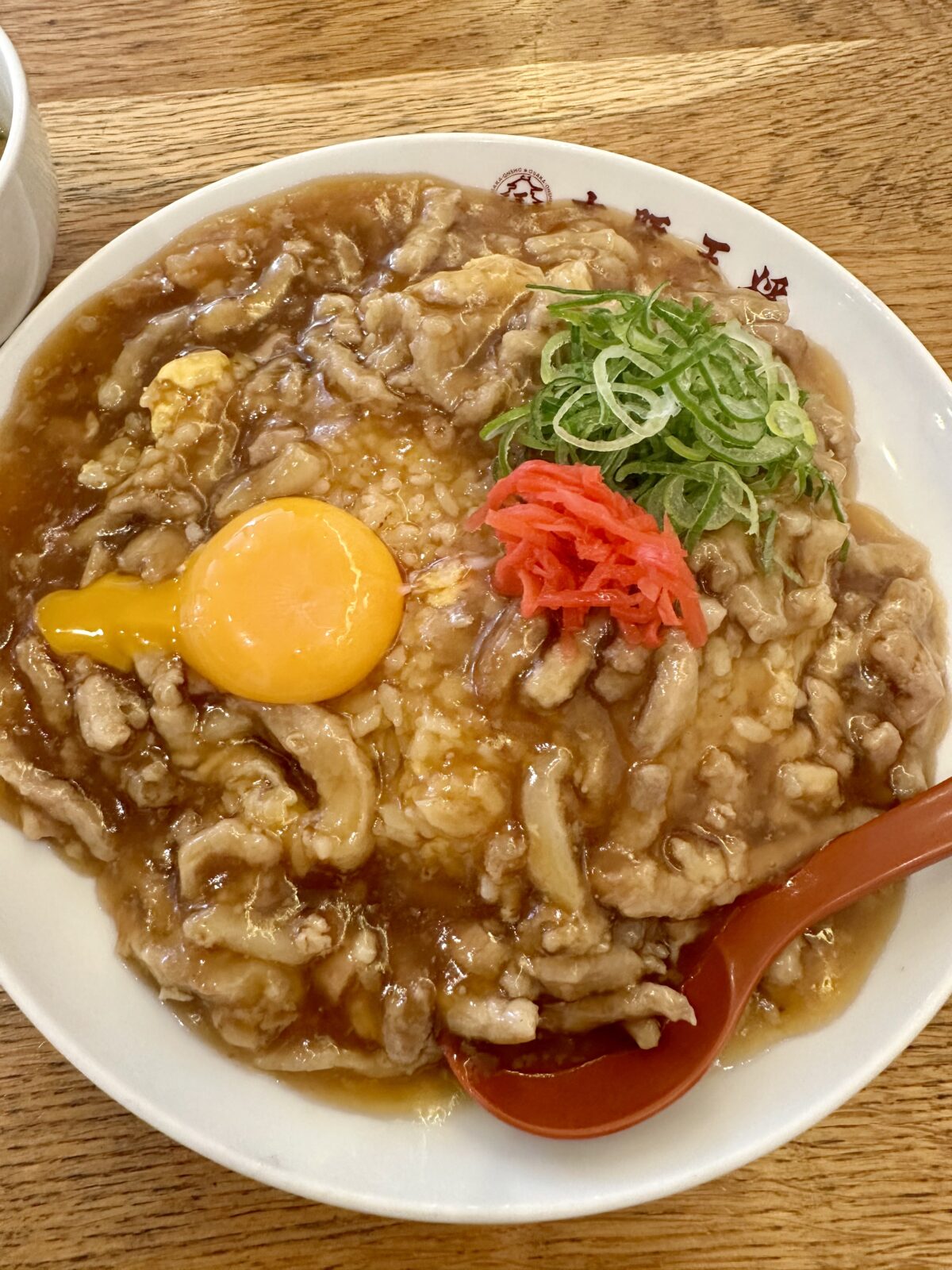 炒飯の上に肉あんかけ、ねぎ、紅生姜、卵のトッピング