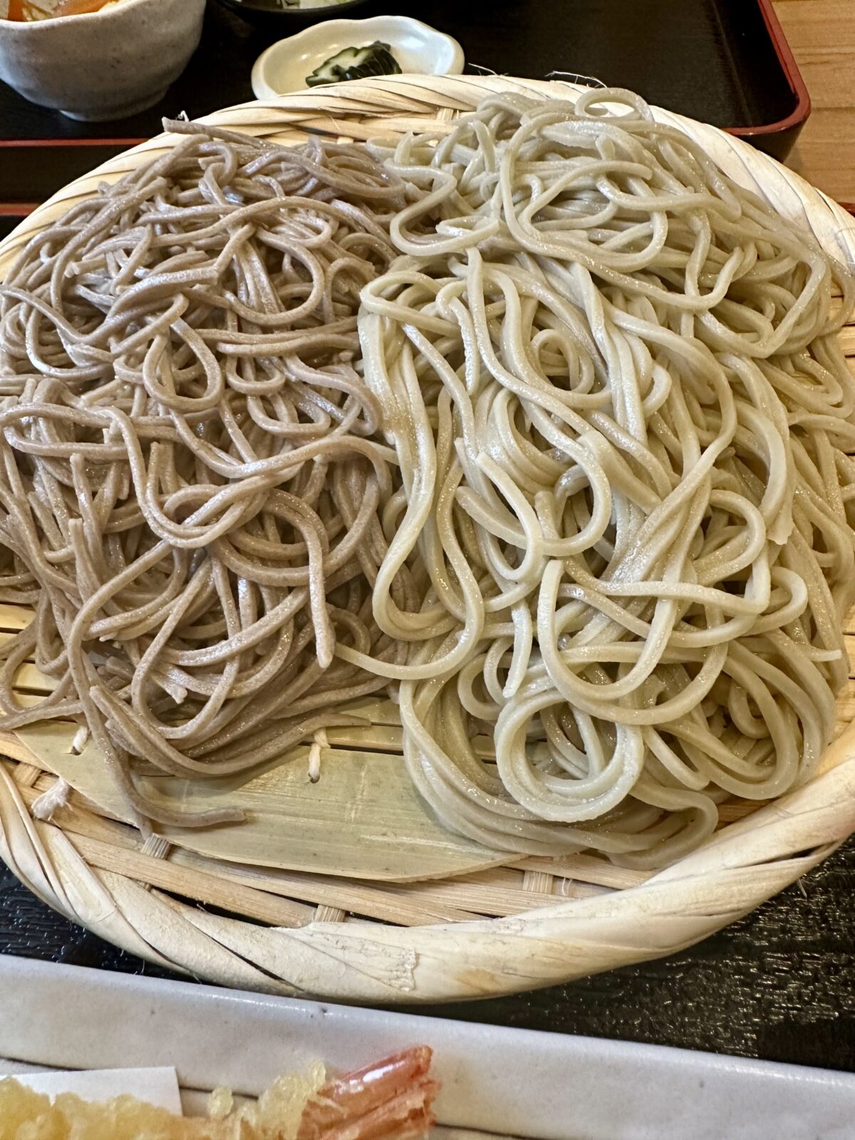 外二蕎麦と田舎蕎麦の相盛蕎麦、汁はつけ麺の温汁と辛汁で楽しめます