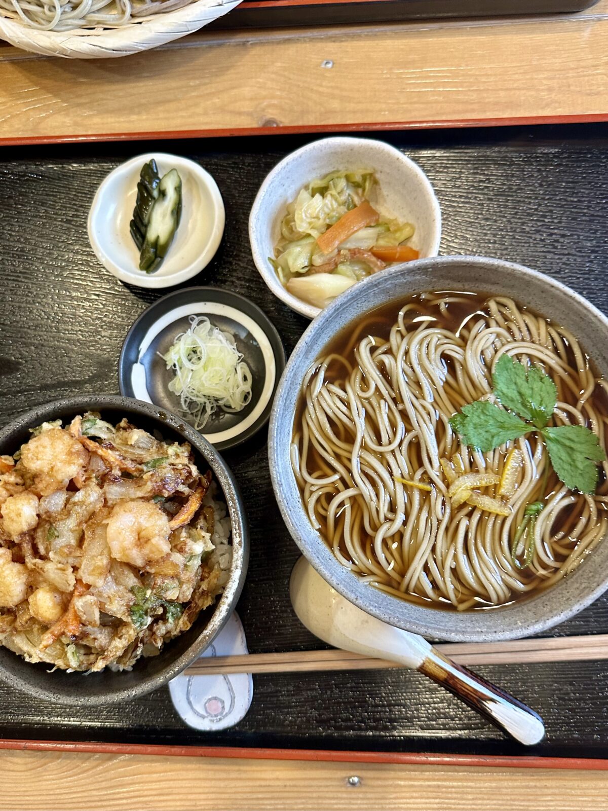 かき揚げ天丼とお蕎麦、小鉢、漬物がつきます