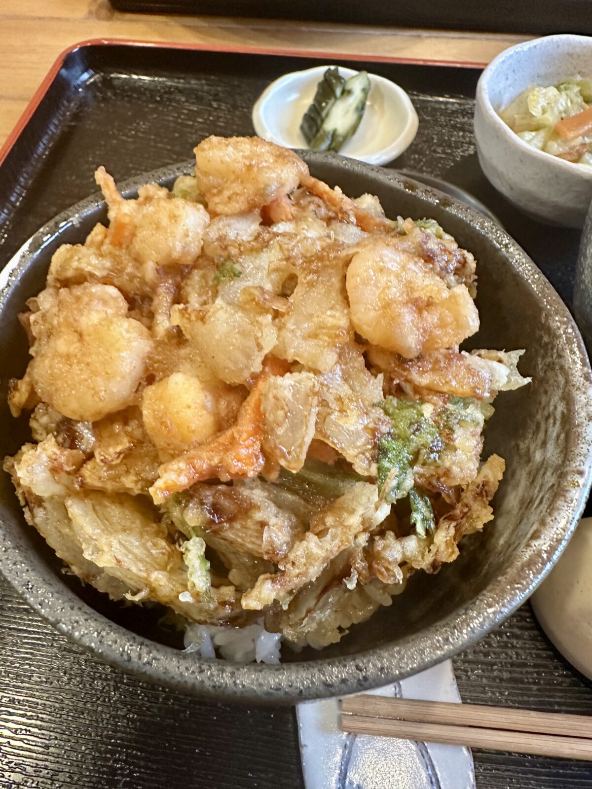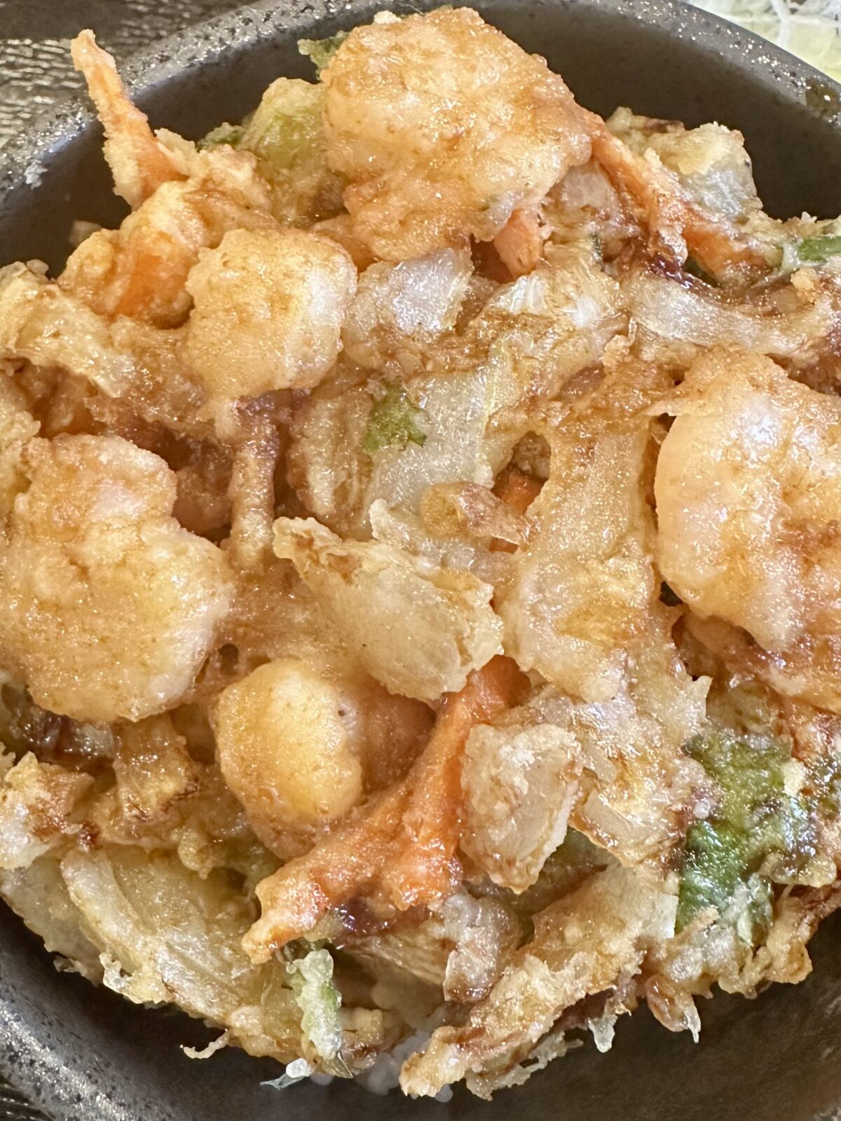 かき揚げは揚げたて、野菜とエビやホタテがたくさん入っています