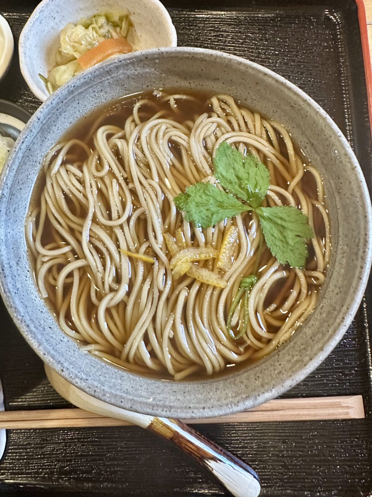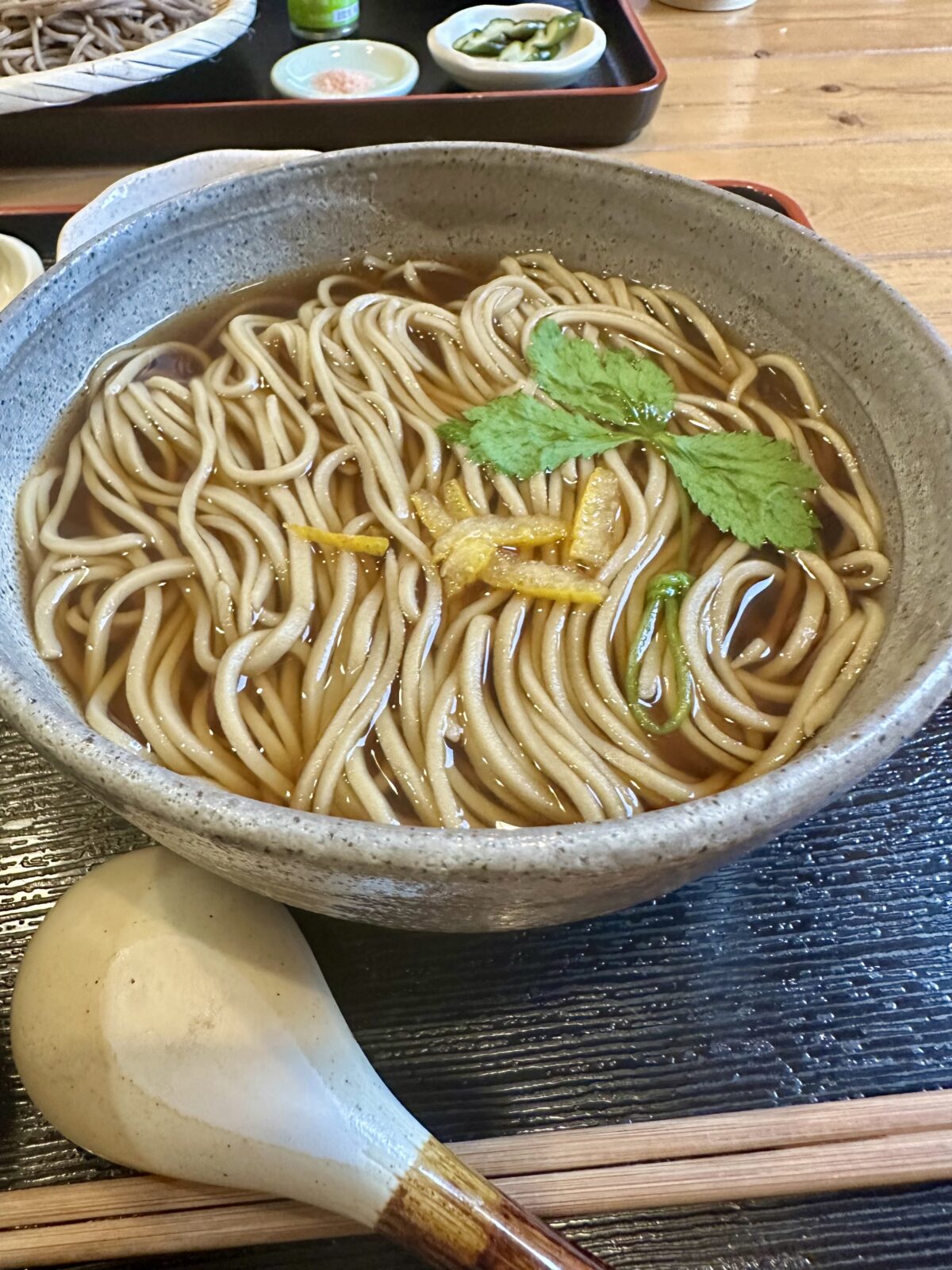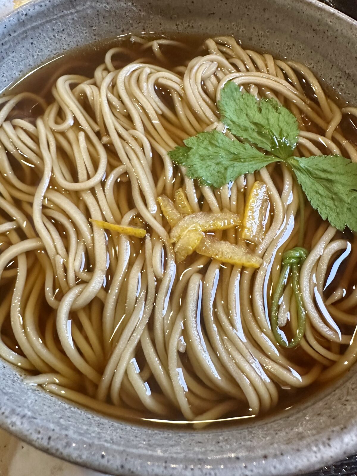 お蕎麦の上には三つ葉と柚子、とても良い香りで食欲が増します