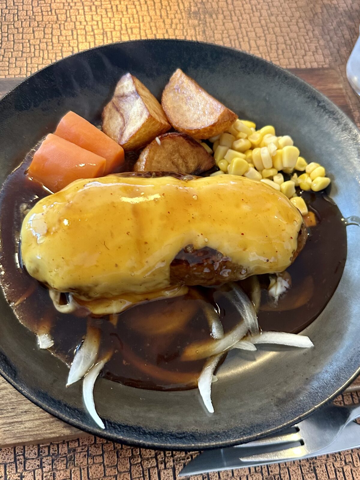 私はチーズハンバーグ 1360円 ライスとブレンドコーヒーのAセット 590円