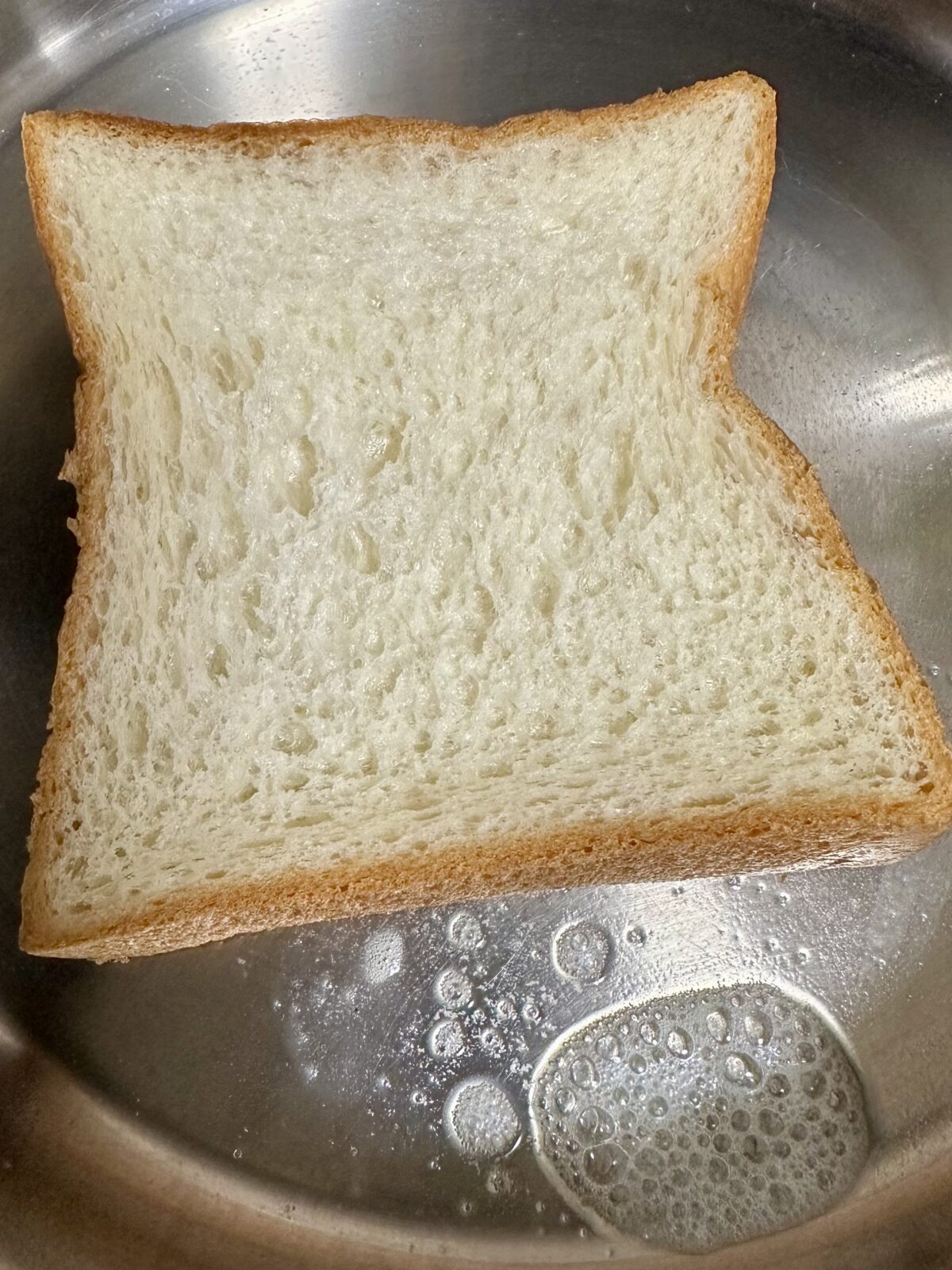 フライパンにバターを落として、やや厚めにスライスしたパンを入れます