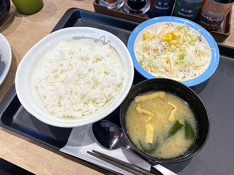 ライス、サラダ、みそ汁の付いたセット。