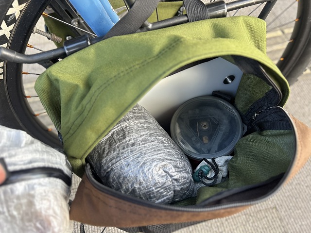中身はこんな感じでドライサックの中にMSRウインドバーナー、着替えのアパレル類、携帯工具、予備チューブ