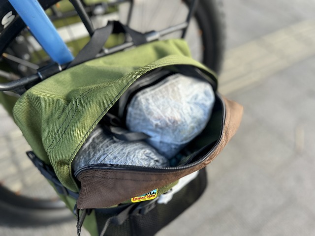 様々なラックに合わせてフックの位置も調整が出来るのでバタつく心配はないし、バック背面の保護パッドのおかげで荒れた面走ってもホイールに巻き込む事もないです。