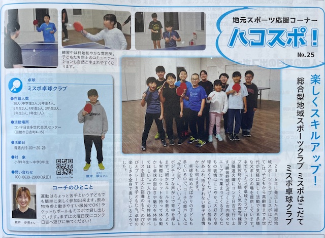 ![]() ダテパー12月号にミスポ卓球クラブが掲載されました 皆さんご覧になってください!! 楽しい雰囲気の中で★卓球は初めてと言う子から誰でも気軽に参加できる小.中学生対象の卓球教室です。難しいことからよりも実際にラケットを持って体を思いっきりつかって卓球の面白さを存分に体験して欲しいです。それぞれの子ども達にあわせた指導を目指しています 初回無料体験を随時受け付けておりますのでお気軽にお問い合わせください♪ |