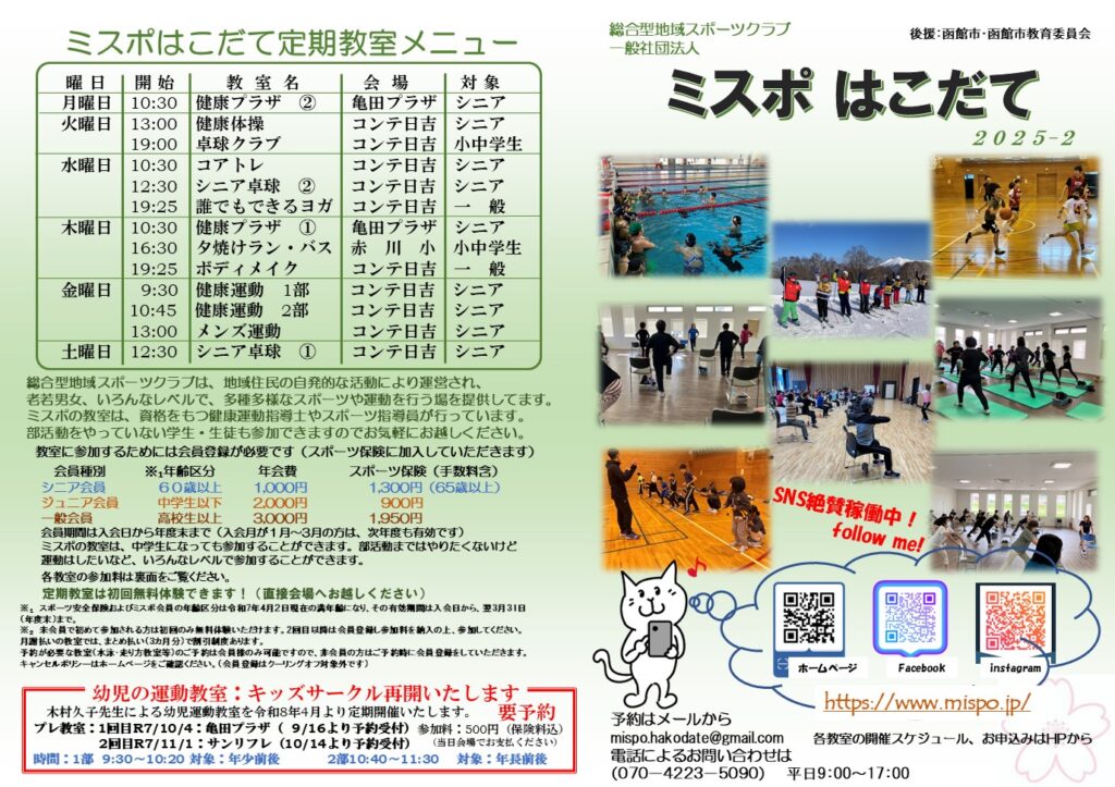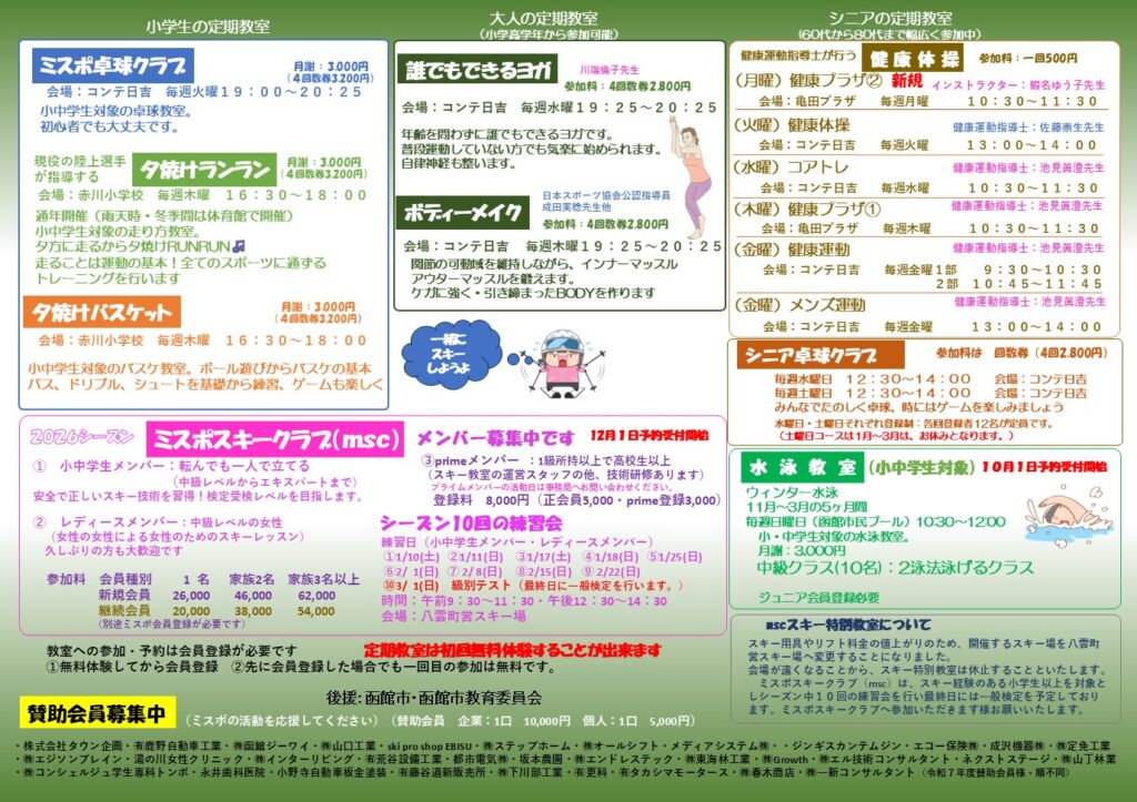 ミスポではジュニア教室からミドル世代・シニア世代とコンテ日吉や亀田交流プラザで楽しみながらできる運動やスポーツを開催しています。